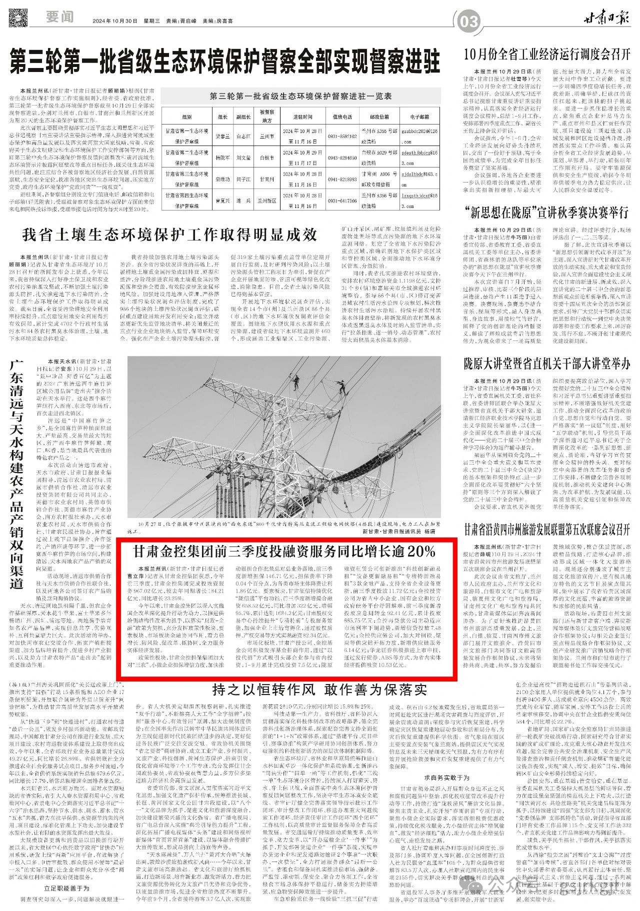 市场化板块,甘肃产投公司、金控基金公司积极发挥基金招商作用,通过“以投代招”方式吸引头部企业参与省内投资,1-9月份累计完成投资7.5亿元;陇原融资租赁公司创新推出“科技创新融易租”“设备更新融易租”“专精特新融易租”3款金融产品,支持全省企业设备更新,前三季度投放11.72亿元;金控投资公司为省内中小企业、国有企业和地方政府债务平台纾困解难,前三季度新增投放应急周转金92.41亿元,累计投放665.75亿元;金控再贷款公司主动适应市场利率下调趋势,新增信贷投放7.48亿元;金控供应链公司,加大对钢铁、煤炭等供应链开拓力度,新增供应链服务6.14亿元;华龙证券积极推进上市申报,通过发行债券、ABS等方式,为省内实体经济提供融资10.53亿元。