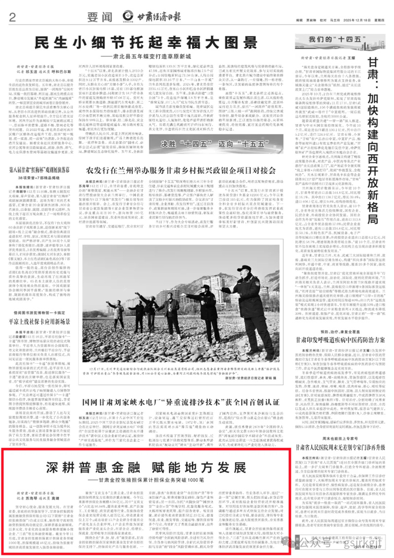 所属金控张掖融资担保有限公司(以下简称“甘肃金控张掖担保”)自成立以来,始终坚守政府性融资担保机构功能定位,深耕普惠金融领域,以多元化、专业化的金融服务精准缓解小微企业、“三农”等主体融资难题。截至今年11月底,甘肃金控张掖担保累计担保业务突破1000笔,担保规模超46亿元,持续为张掖市域经济高质量发展注入强劲金融动能。